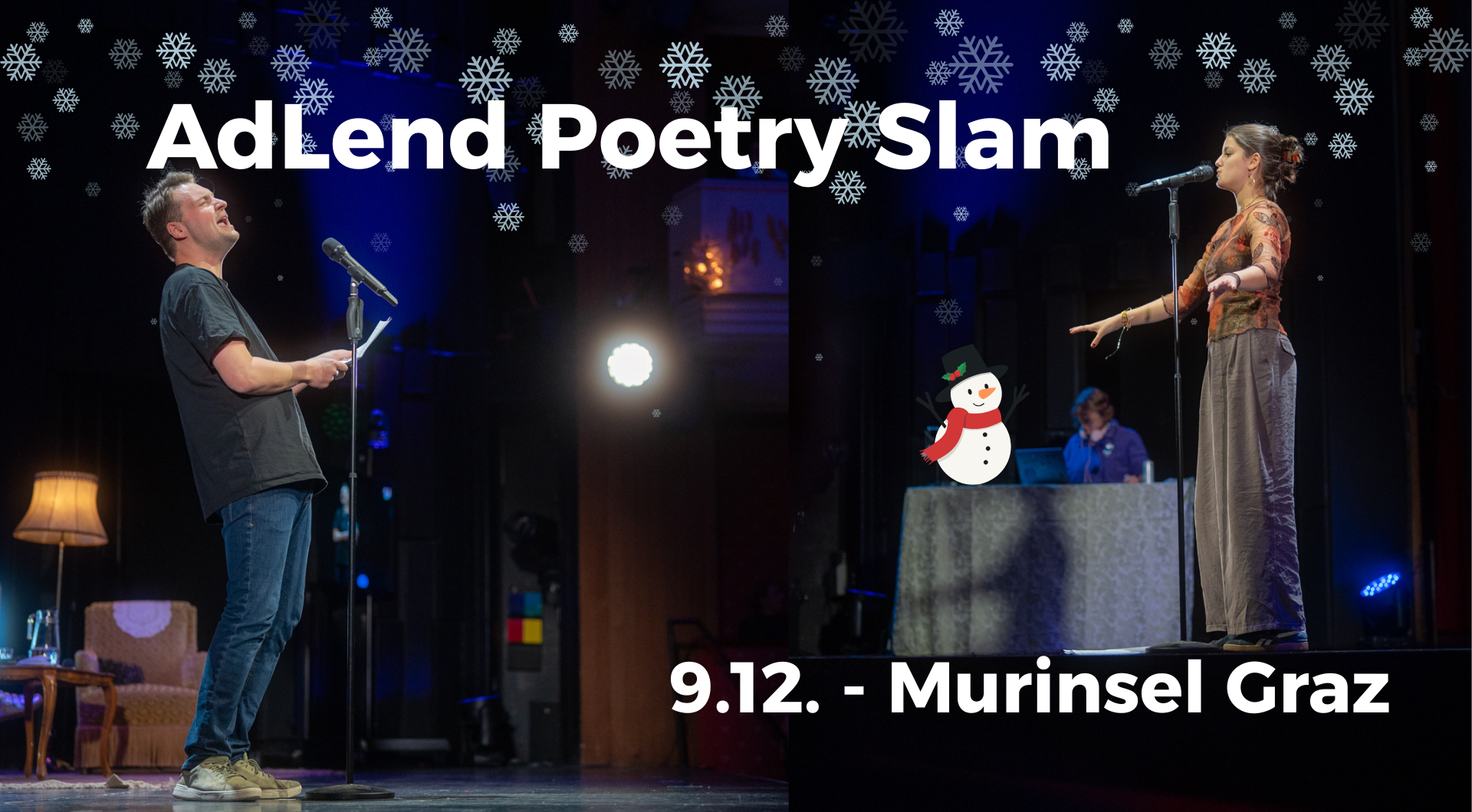 AdLend Poetry Slam AdLend, AdLend, mein Glühweinstand brennt - Erst 1, dann 2, dann 3, dann 4, jetzt steht die Ordnungswache vor der Tür! Die Adventszeit in Graz ist immer ein Spießrutenlauf. Wie